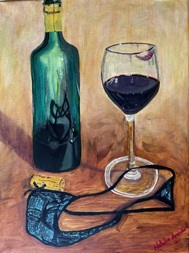 Una copa marcada, por un labial una botella abierta, y un gesto detenido tras el instante.Una obra que evoca esos momentos donde nos dejamos llevar: pasión, emoción y sensualidad convertidas en imagen.