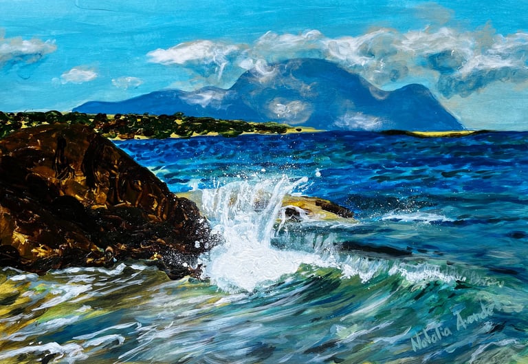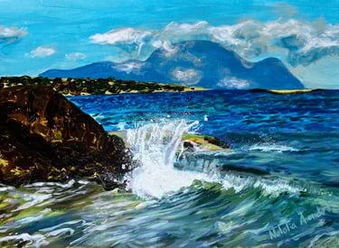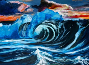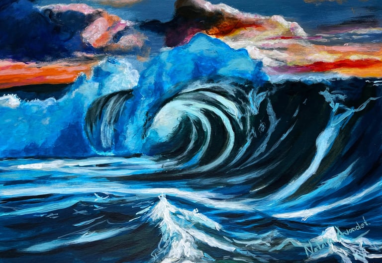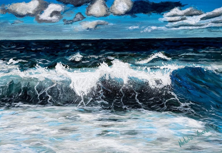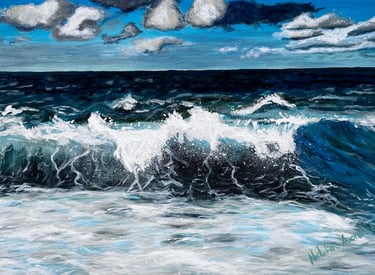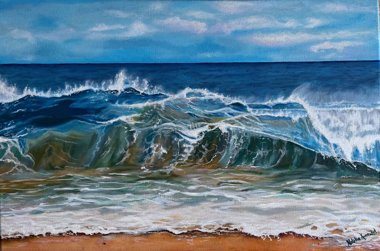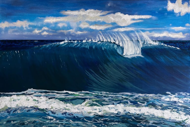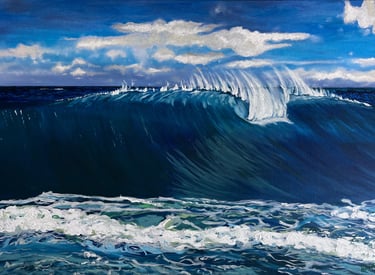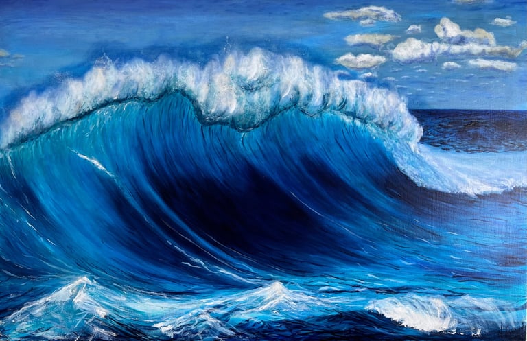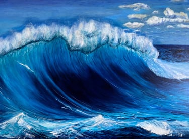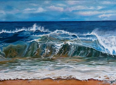 Muestra el mar en un instante de plenitud: una ola poderosa que avanza bajo un cielo despejado, transmitiendo energía y calma a la vez. En esta obra, la fuerza del océano no se presenta como amenaza, sino como equilibrio.Es el recordatorio de que la verdadera fortaleza puede habitar en la serenidad, y que incluso en la calma late un poder inquebrantable. El mar, constante en mi obra, refleja la mente de una mujer: nunca se detiene, siempre en movimiento, siempre viva.