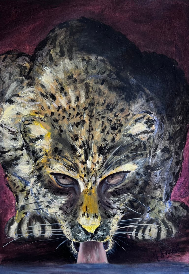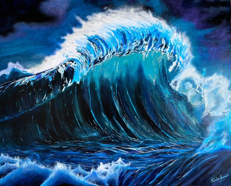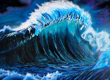 Representa la fuerza desatada del océano, ese momento en el que la calma desaparece y todo se convierte en energía pura. El mar es un tema constante en mi obra porque refleja la mente de una mujer: nunca se detiene, nunca se aquieta. En esta pintura, la ola se convierte en símbolo de resistencia, intensidad y movimiento continuo, recordando que la vida —como el mar— es fuerza en transformación.