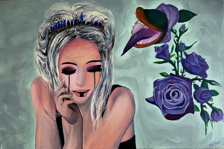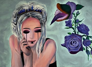 Una obra figurativa con un toque surrealista: la delicadeza de la figura femenina contrasta con la fuerza simbólica de la flor-boca, creando un impacto visual potente y memorable. La combinación de óleo y acrílico aporta profundidad y textura, mientras que cada trazo refleja dedicación y precisión. Con un concepto gótico, simbólico y dramático, esta pieza está pensada para coleccionistas que buscan obras con carácter y narrativa.