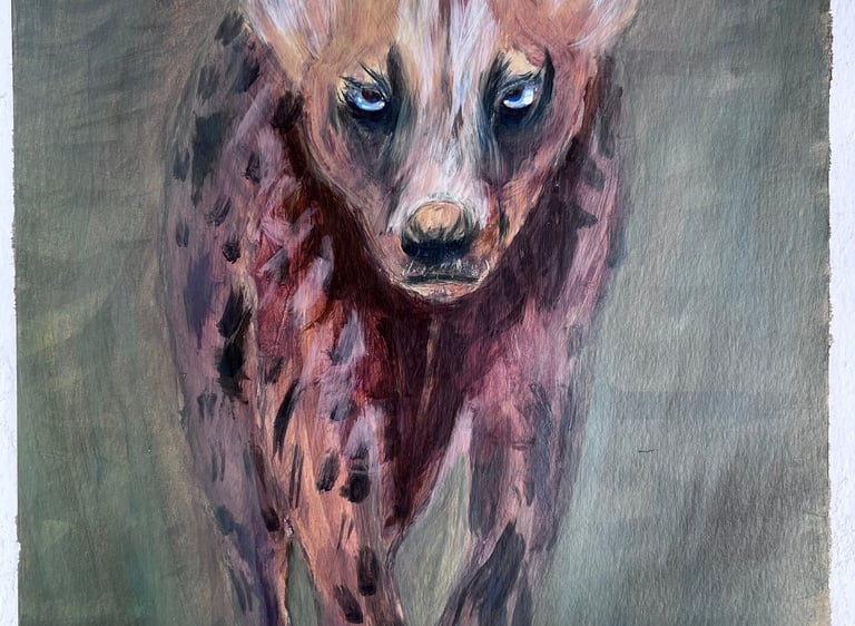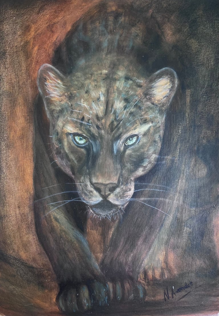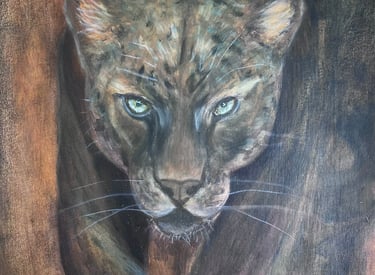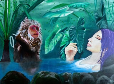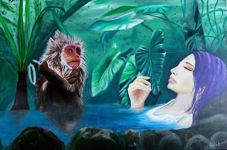 Empatía es una obra que refleja el encuentro silencioso entre una mujer y un mono, unidos por la mirada y el gesto en un espacio natural. La escena habla de conexión, respeto y reconocimiento mutuo entre dos seres que comparten vulnerabilidad y fortaleza. En esta pintura, la mujer representa a todas aquellas voces que han sido calladas, y el animal simboliza esa misma condición de ser ignorado. Frente a frente, ambos se miran desde la igualdad, recordándonos que la empatía es un puente que rompe ronteras entre especies y entre historias de silencio.