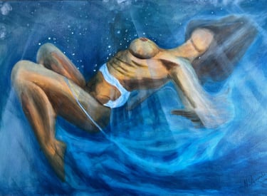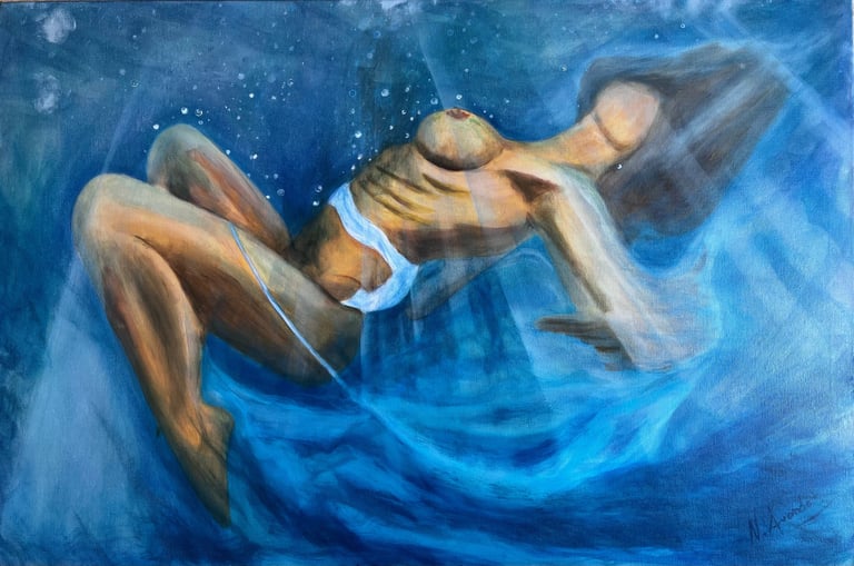 Una obra por encargo que me llevó fuera de mi zona de confort: exploré la sensualidad desde la escucha, sumergiendo su esencia en el agua para transformar su historia personal en pintura viva.